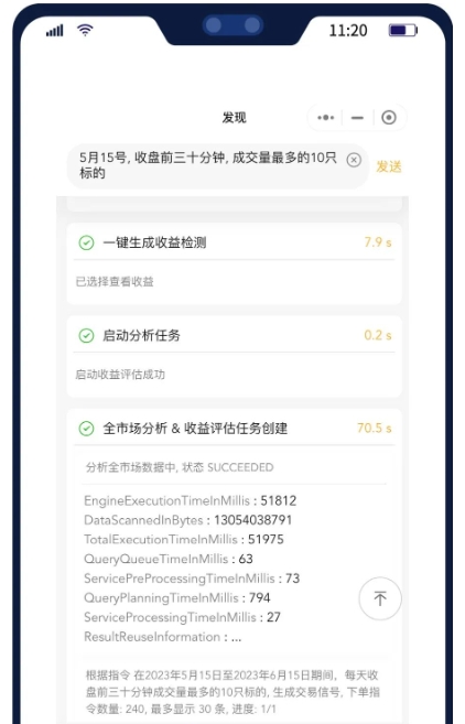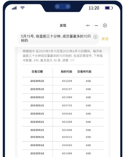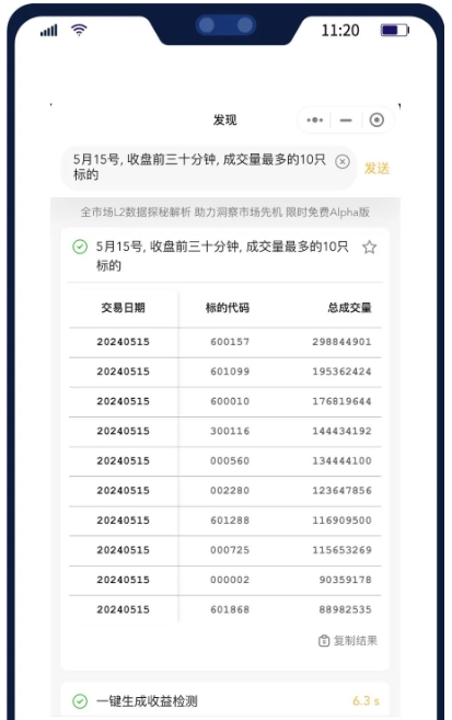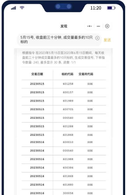 利用自然语言交互,让定义交易信号或筛选条件变得直观而简单,只需简单描述,如“5月15日,收盘前三十分钟,成交量最多的10只标的”,我们的系统即可智能识别在特定时间段内流动性最高或交易最活跃的证券。